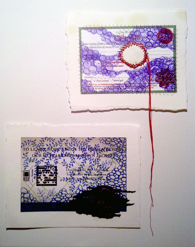 Also, I liked the idea of working with an item which annoyed many and that most people just toss. This was the same attraction that brought me to my bottle cap jewelry business, many moons ago. And as happened with the bottle-caps is happening with the cards, as I start collecting subscription cards I notice the vast variety, some with wonderful colors, designs and graphics. When I draw on each card I incorporate these elements in the larger design. As with so much of my work, I view the card as a puzzle to solve, how do I make the card work as a whole. However, also allowing an intuitive, organic approach to the drawing. This is the similar theory behind my 'creatures'.
